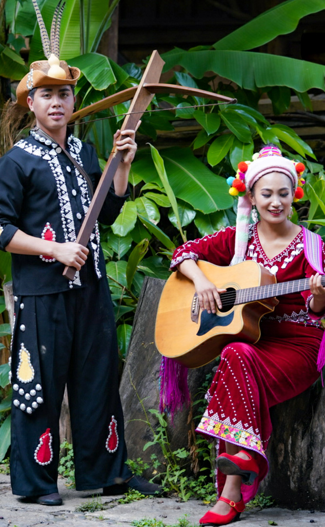 德昂族人口約1.7萬,主要分布在德宏州和保山市的潞西、梁河、瑞麗、隴川、隆陽等縣區。民居多為草排覆頂竹木結構的干欄式建筑,眼前的德昂村建筑納入了能容納數十人居住的德昂大房子,氈帽頂的小房子,還有頗具浪漫色彩的大公房、小公房……還建有“龍陽塔”標志及佛教奘房、佛塔。德昂族民間普遍信奉南傳佛教,民俗活動與佛事活動關聯緊密。潑水節(jié)、開門節(jié)、關門節(jié)是重大節(jié)日。德昂族服飾色彩豐富,口頭文學特別是民歌創(chuàng)作活動...